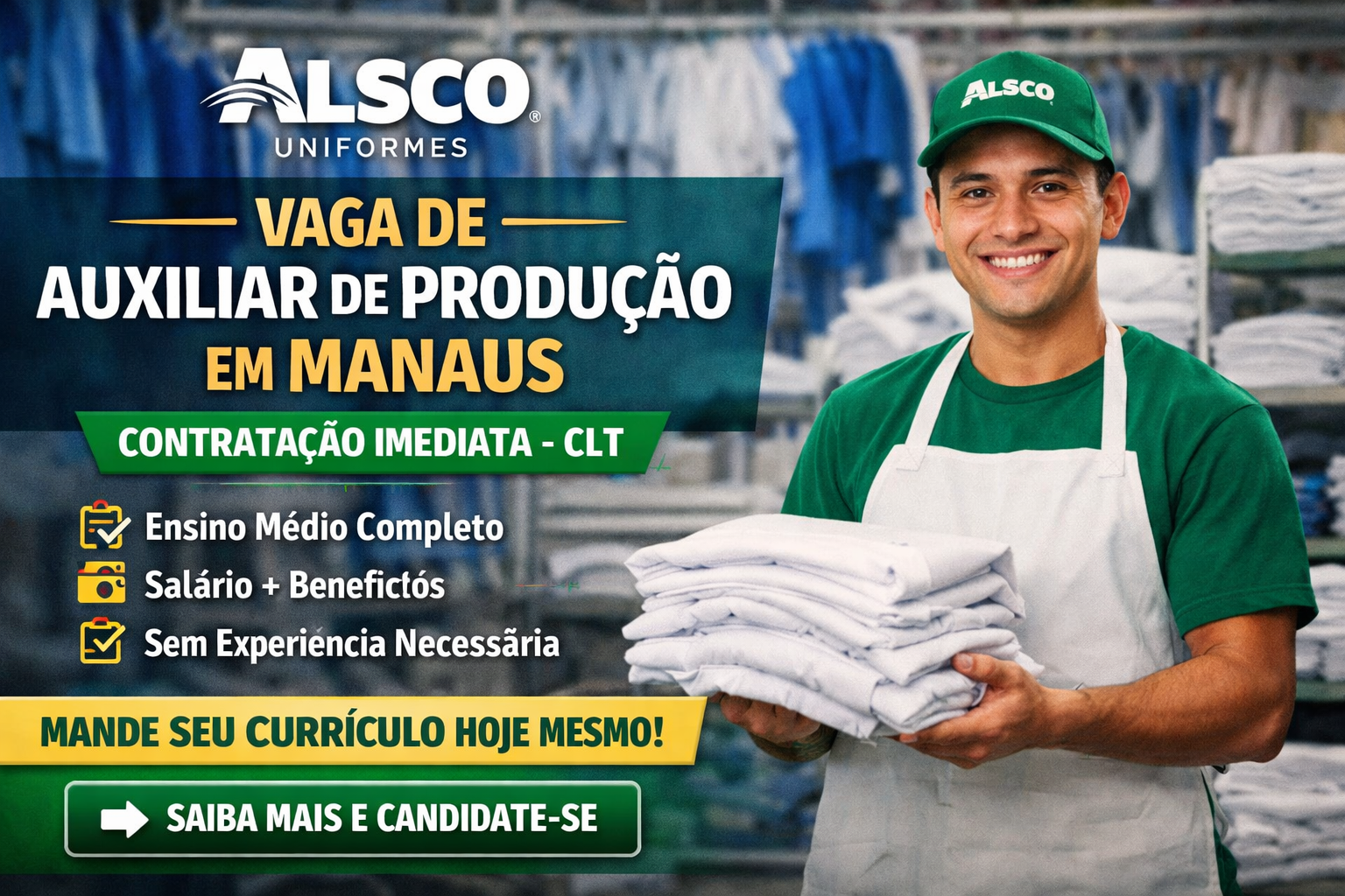 Essa vaga de Auxiliar de Produção em Manaus na Alsco Uniformes é uma excelente oportunidade para quem quer começar ou voltar ao mercado de trabalho.