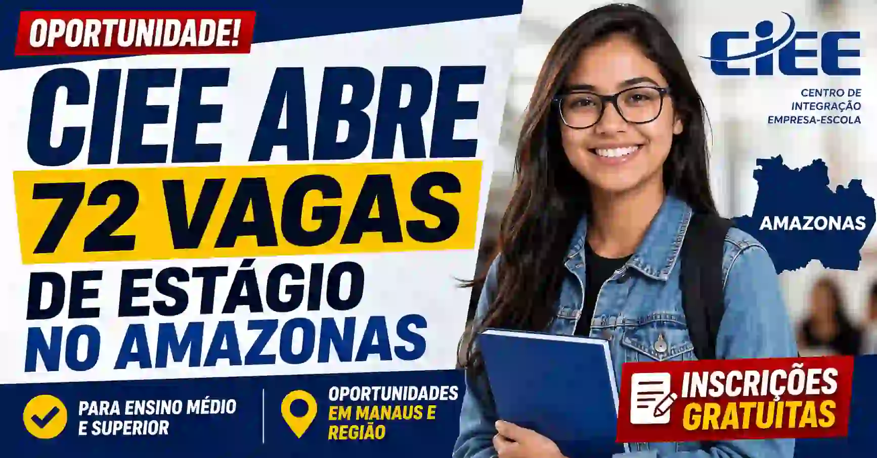 O Centro de Integração Empresa-Escola anunciou a abertura de 72 vagas de estágio no Amazonas, contemplando estudantes do ensino médio e superior em diversas áreas.