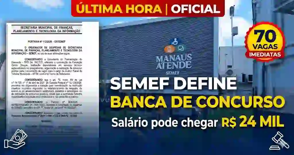 A Secretaria Municipal de Finanças, Planejamento e Tecnologia da Informação de Manaus (Semef) deu mais um passo importante para a realização de um dos concursos mais aguardados do Amazonas. Foi definida como banca organizadora a Fundação Carlos Chagas (FCC), responsável por conduzir o certame para o cargo de Auditor Fiscal de Tributos Municipais.