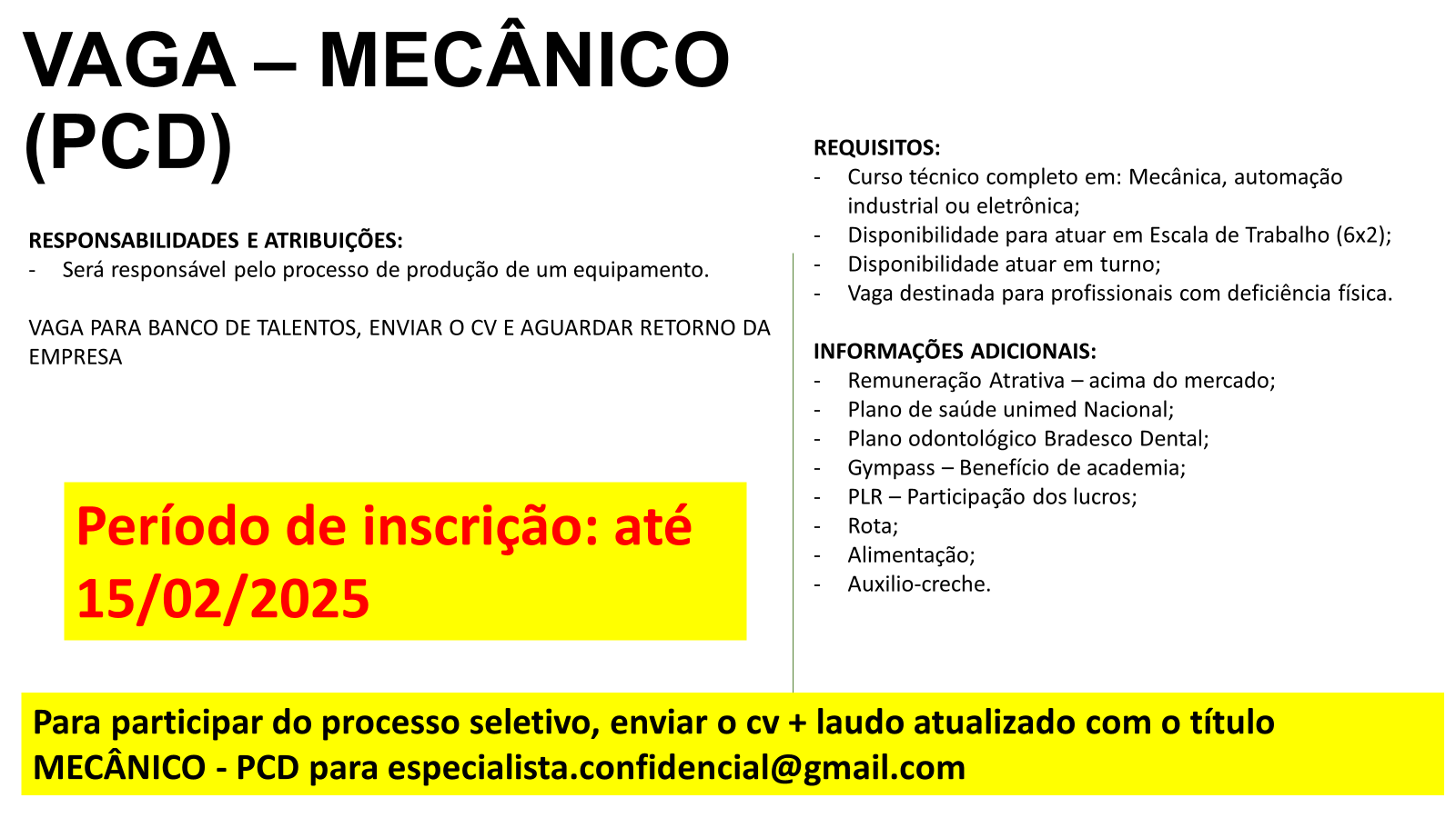 Para participar do processo seletivo, enviar o cv + laudo atualizado com o título MECÂNICO – PCD para [email protected]