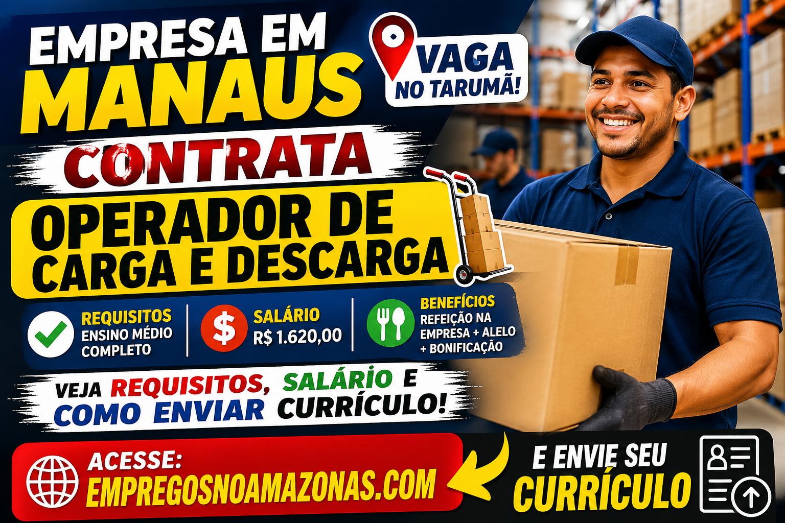 Quem está procurando vaga de emprego em Manaus pode aproveitar uma nova oportunidade divulgada para o cargo de Operador de Carga e Descarga. A chance é destinada para profissionais que desejam trabalhar com movimentação de mercadorias, organização de materiais e apoio nas atividades do setor logístico.