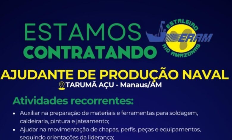 O Estaleiro Rio Amazonas está com vaga aberta para Ajudante de Produção Naval em Tarumã-Açu, Manaus. Saiba quem pode se candidatar, quais são as atividades, os benefícios e como enviar o currículo de forma simples e rápida