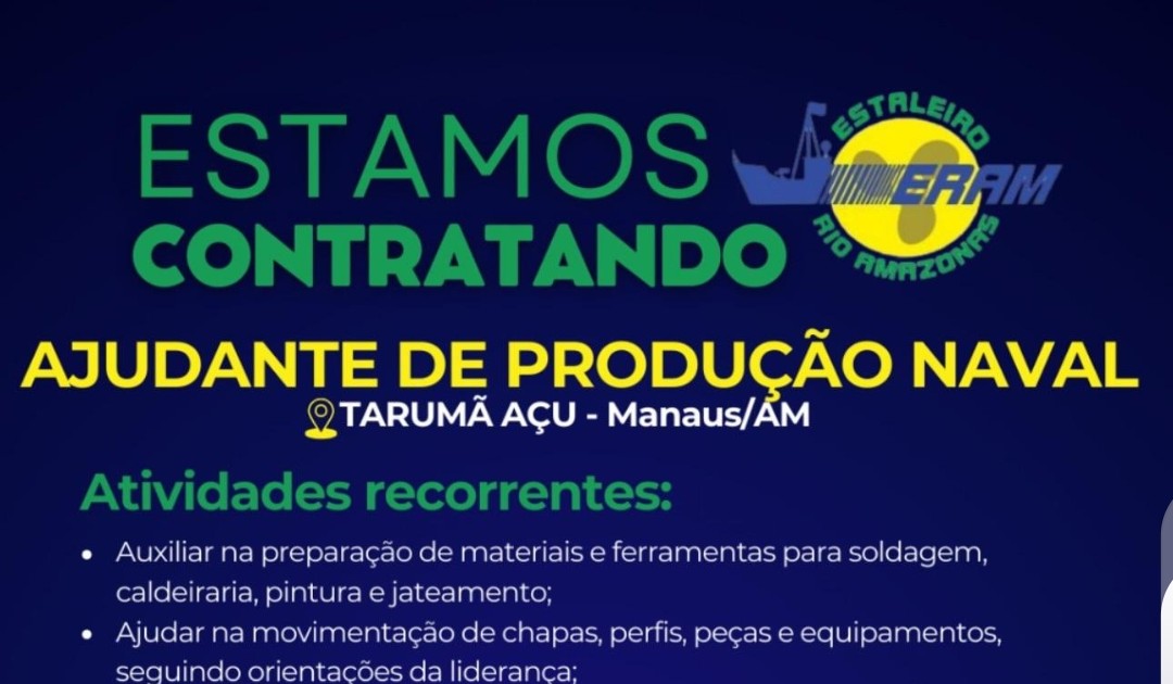 A vaga de Ajudante de Produção Naval em Manaus é para atuar no bairro Tarumã-Açu, uma área conhecida por concentrar empresas do setor naval. Com isso, surgem boas oportunidades de trabalho para moradores da região.