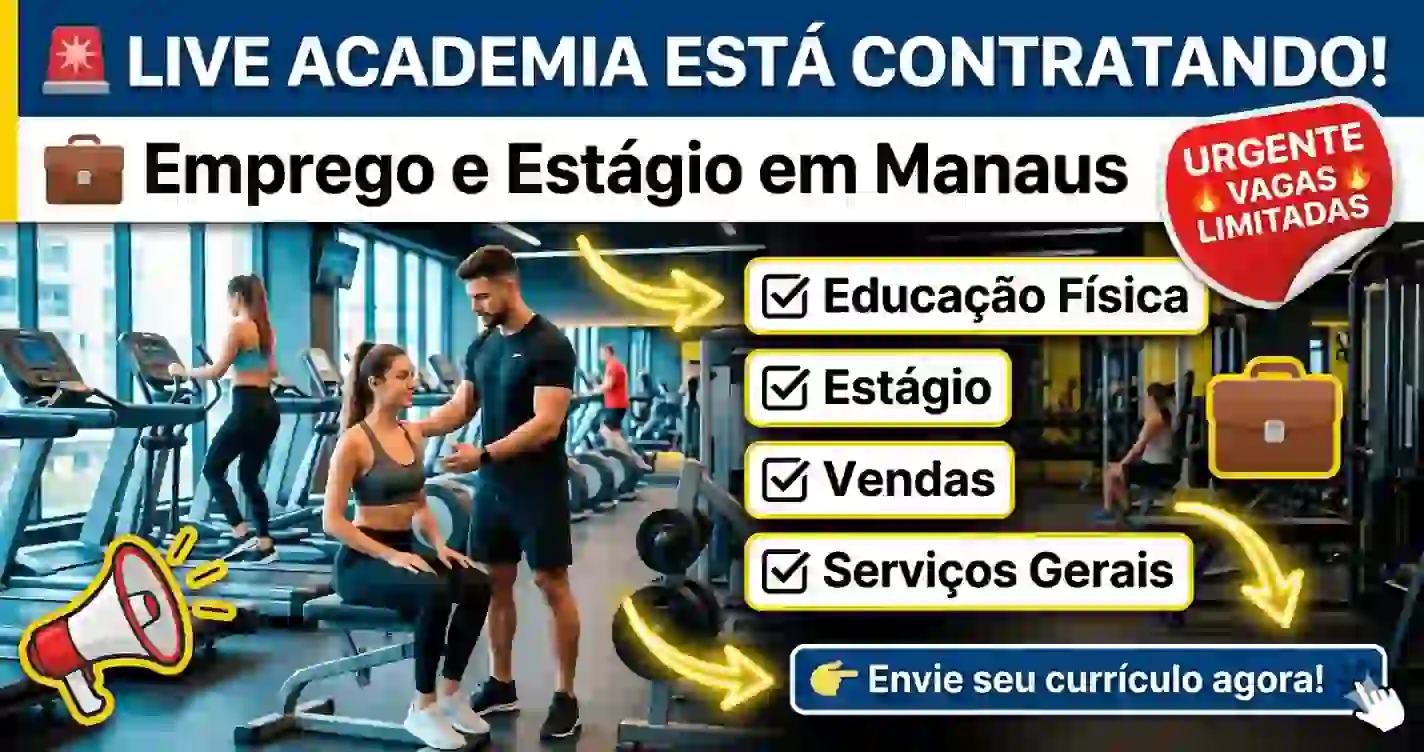 A Live Academia anunciou a abertura de novas vagas de emprego e estágio na capital amazonense. As oportunidades foram divulgadas recentemente nas redes sociais da empresa e contemplam diferentes áreas, incluindo setor técnico, comercial e operacional.