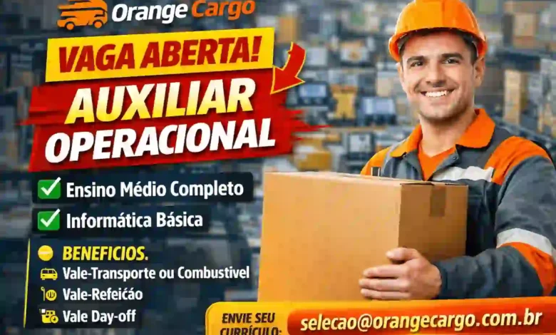 auxiliar operacional orange cargo, vagas logística 2026, emprego auxiliar operacional, vagas ensino médio completo, trabalhar em logística, emprego com benefícios, enviar currículo por email