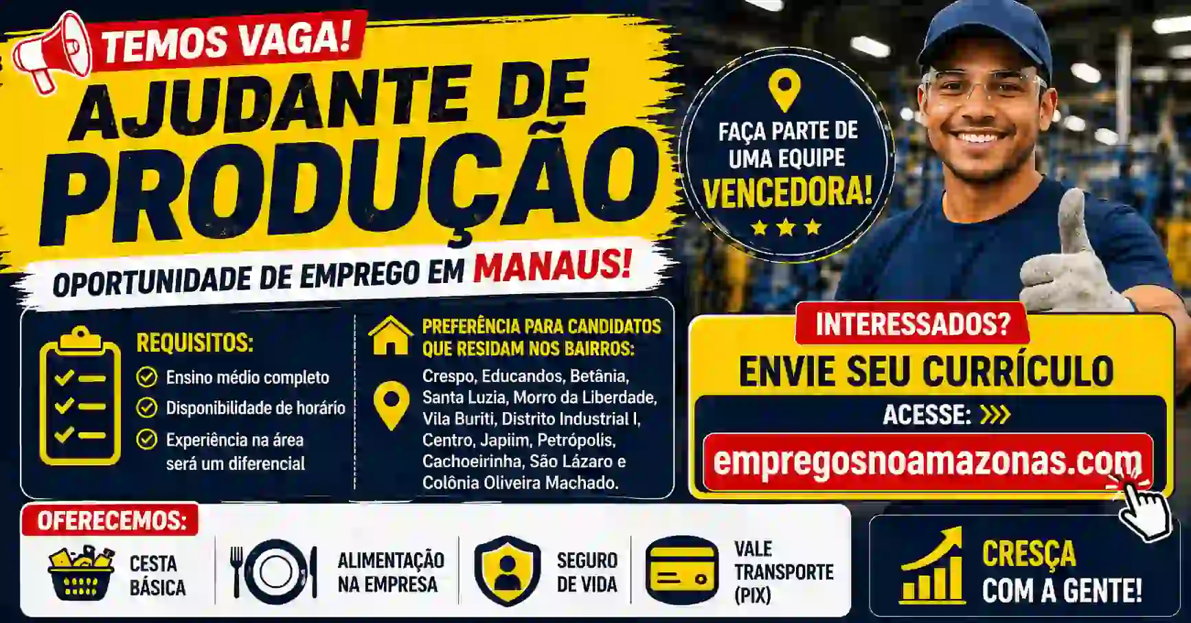 A vaga de Ajudante de Produção em Manaus é uma ótima oportunidade para quem busca entrar ou se firmar no setor industrial. Com benefícios atrativos e possibilidade de crescimento, vale a pena enviar seu currículo e participar do processo seletivo.