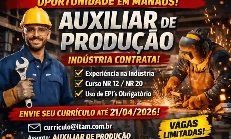 Empresa industrial abre vaga para Auxiliar de Produção em Manaus. Confira requisitos, atividades e veja como enviar seu currículo até 21/04/2026.