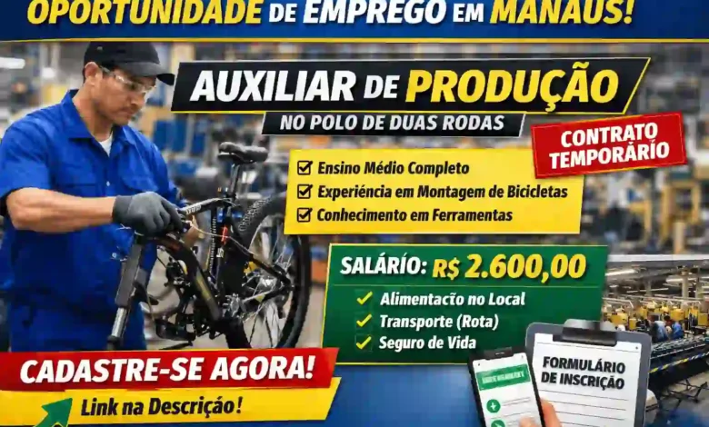 Vaga para Auxiliar de Produção no Polo de Duas Rodas em Manaus com salário de R$ 2.600,00 + benefícios. Confira requisitos e saiba como se candidatar.