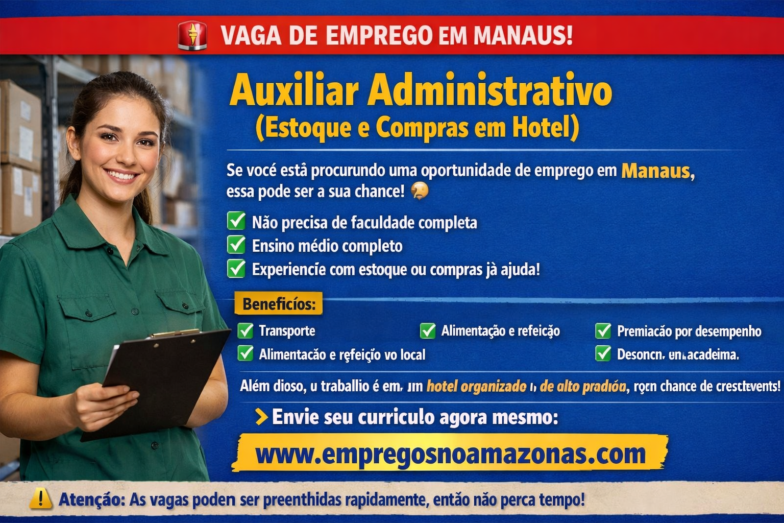 Se você está em busca de uma vaga de emprego em Manaus, essa pode ser a oportunidade ideal. Um hotel de alto padrão está contratando Auxiliar Administrativo para atuar na área de estoque e compras, oferecendo benefícios e um ambiente organizado para trabalhar.