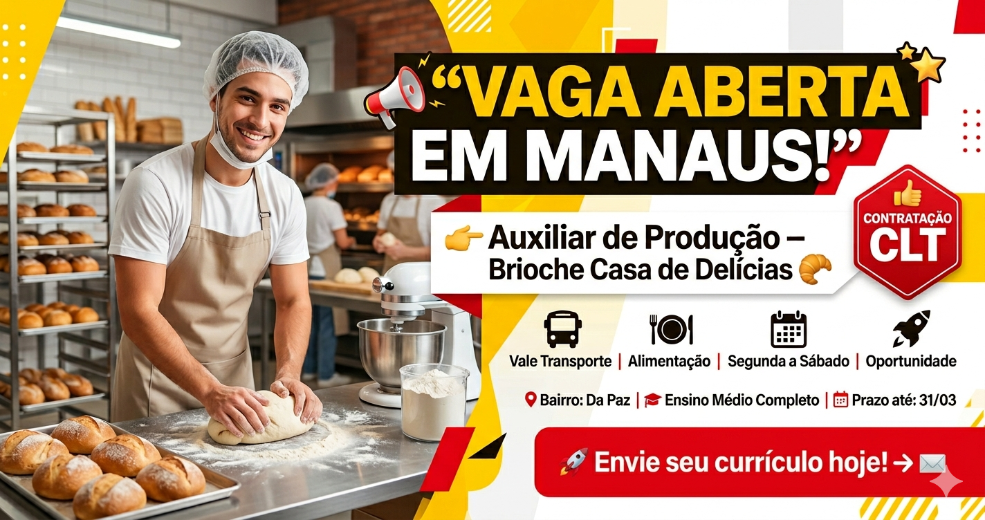 Procurando vaga de emprego em Manaus? Veja todos os detalhes da oportunidade para Auxiliar de Produção na Brioche Casa de Delícias e saiba como enviar seu currículo hoje mesmo!