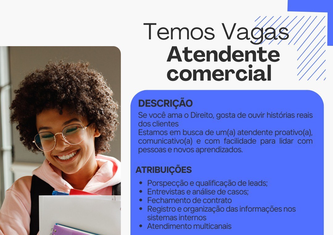 Essa vaga é ideal para quem gosta de conversar, ouvir pessoas e aprender constantemente. Trabalhar como atendente comercial ajuda a desenvolver comunicação, organização e confiança, habilidades que servem para toda a vida profissional.