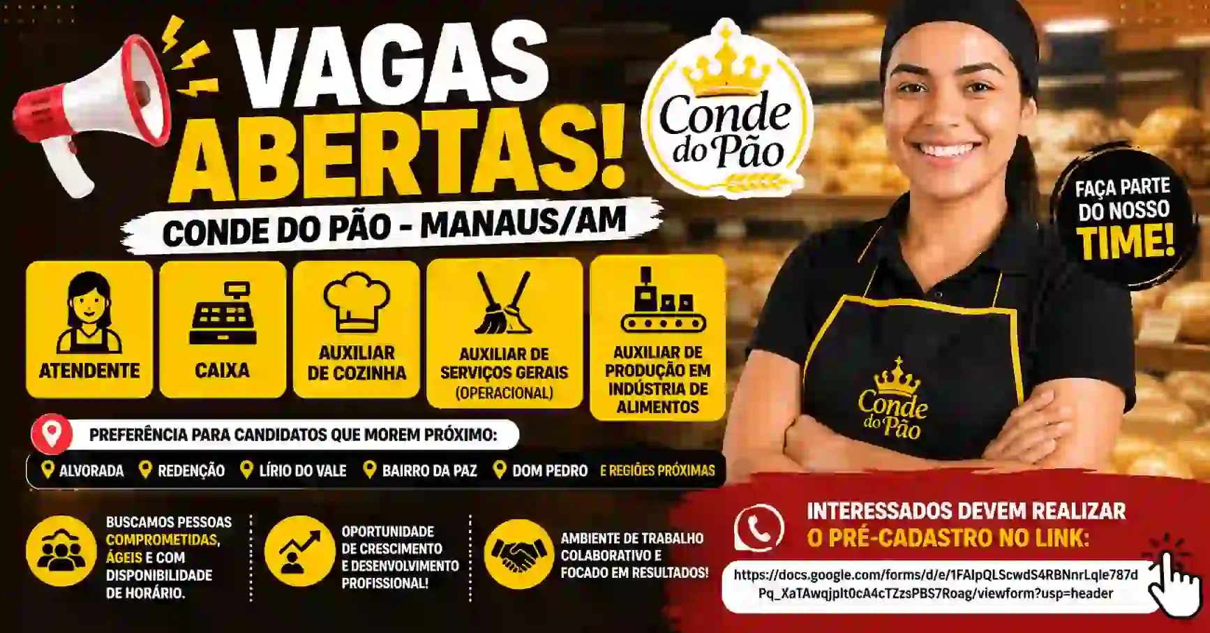 Se você está em busca de uma oportunidade de emprego em Manaus, essa pode ser a sua chance! A empresa Conde do Pão anunciou novas vagas abertas para diferentes áreas operacionais e de atendimento. As oportunidades são ideais para quem deseja ingressar ou se recolocar no mercado de trabalho, especialmente no setor alimentício.