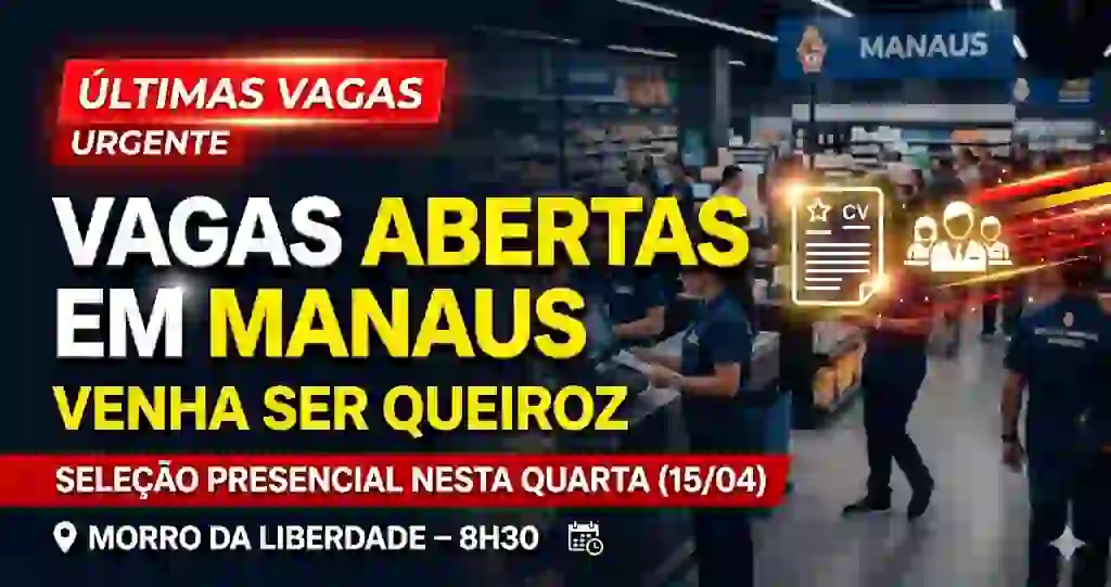Vem ser Queiroz: empresa abre vagas em Manaus e realiza seleção presencial no dia 15/04 no Morro da Liberdade. Saiba como participar e garanta sua chance.
